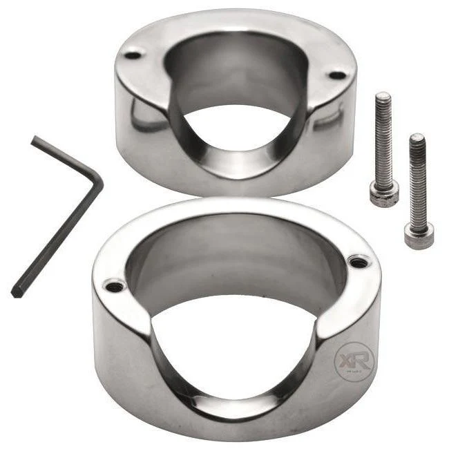 Getting it on is easy. Just push your cock and balls through the bigger ring. Then place your cock through the smaller ring while your balls fall through the combined gap. Watch out for pinching! Once together, slide the hex bolts into the front of the unit and tighten them with the included hex wrench. Once complete your cock and balls will be locked in heavy stainless steel elegance.